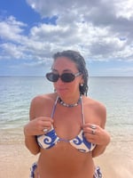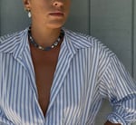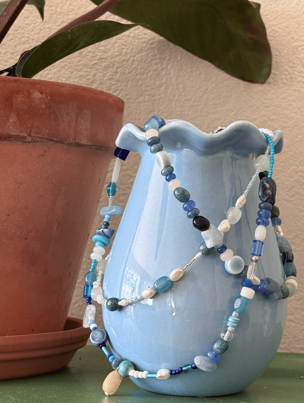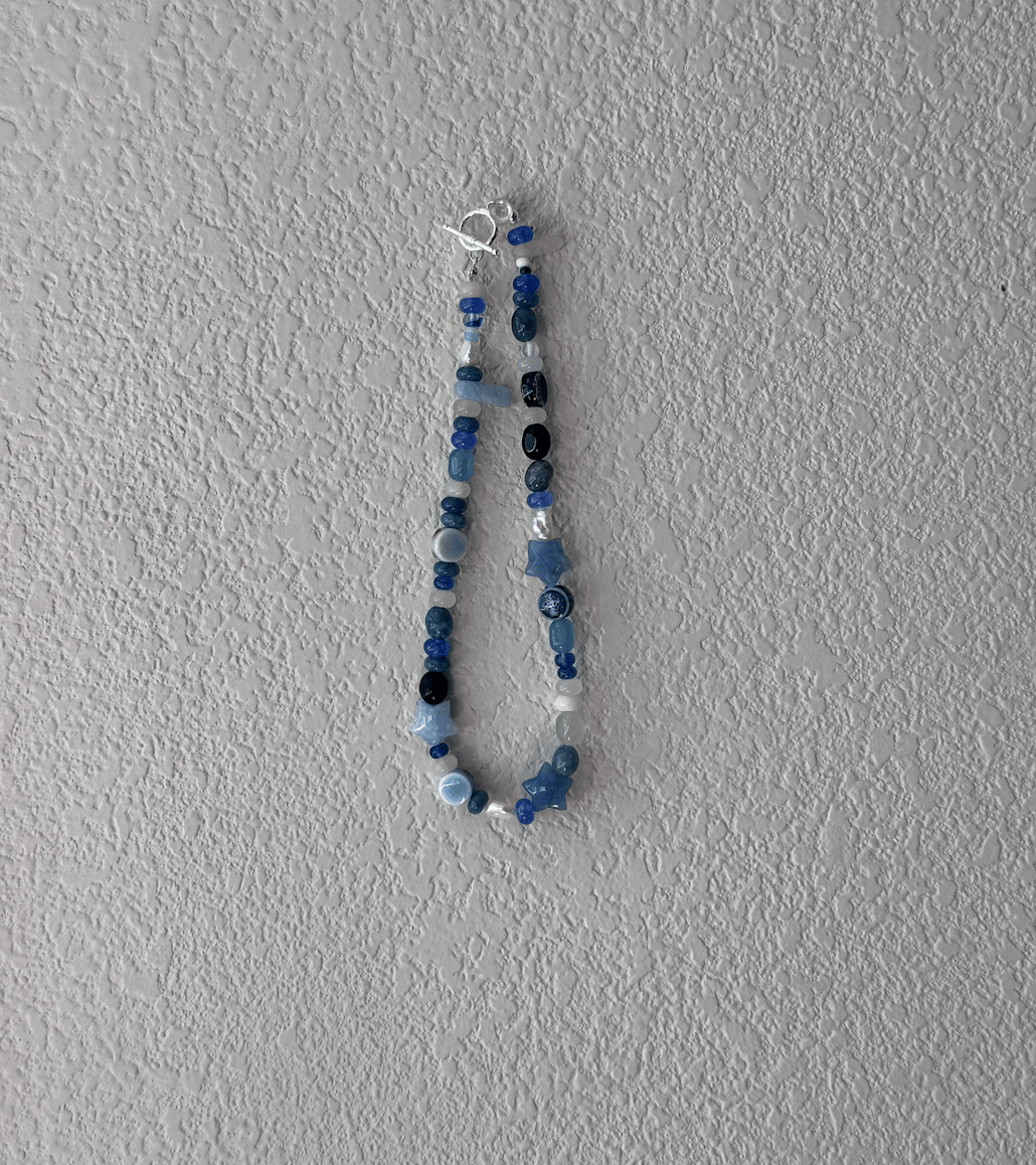 blue chunky necklace with star beads and pearls. secured with silver toggle clasp.